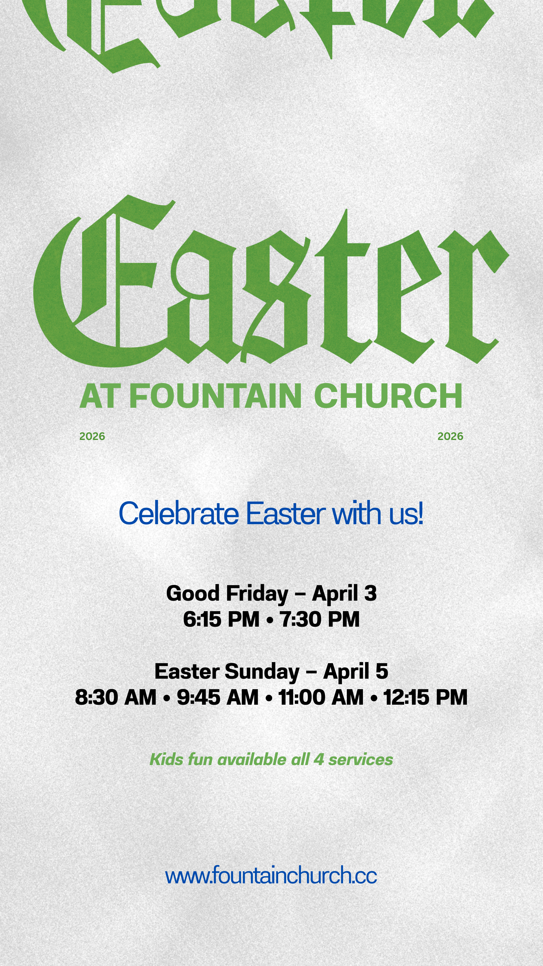 Easter services are typically 60 minutes, including worship, a message, and time for response.